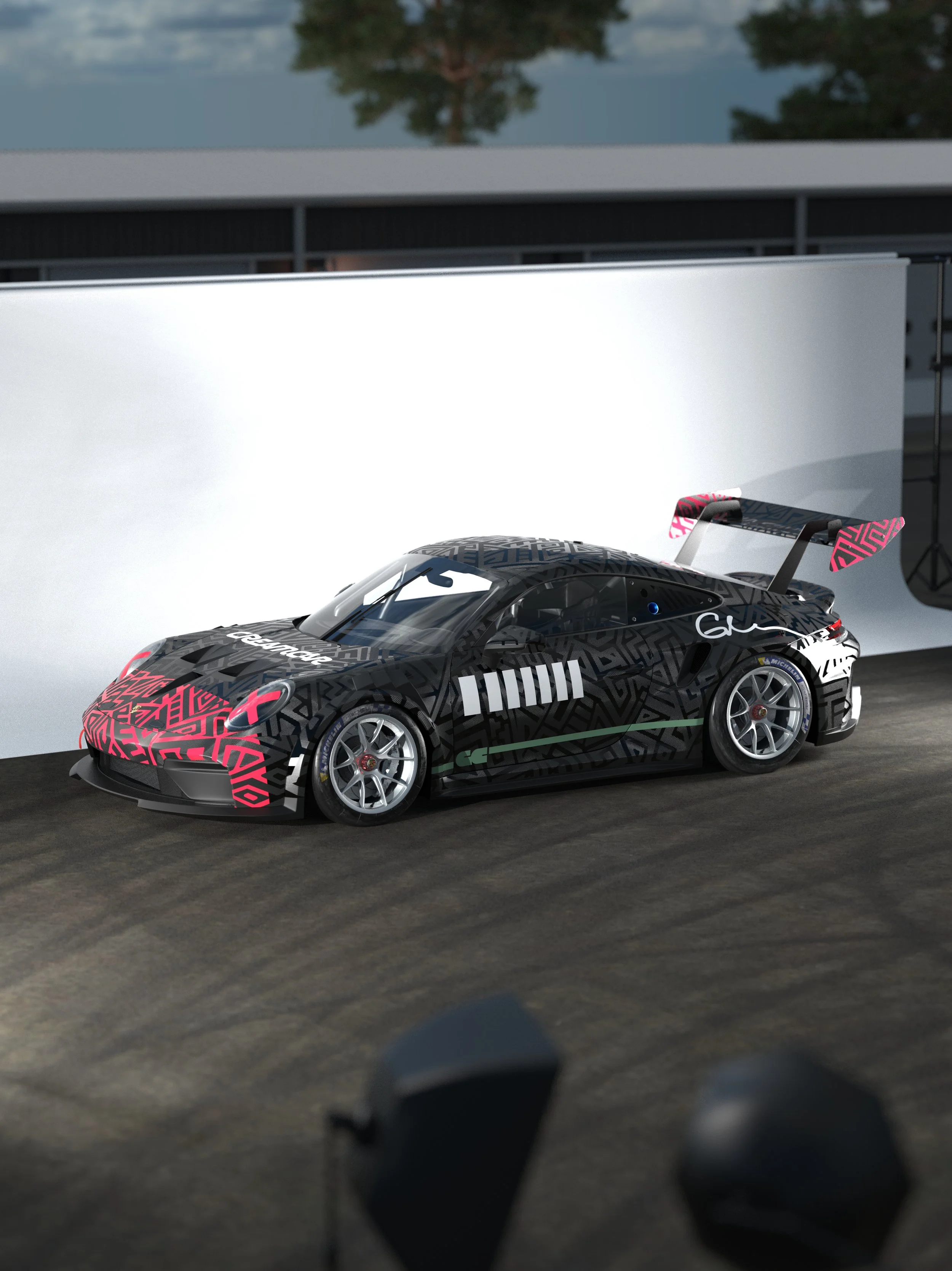 The livery, or the graphic design elements applied to the exterior of a vehicle, is an important part of a race team. I’ve been happy to work with a few teams over the last few years to bring their cars to life and make a visual impact. My personal philosophy on livery design is that it needs to be noticeable and pop from a distance, but also have interesting detail that can only be appreciated up close. With that said, I always work with the client to understand what they want. Sometimes it’s certain colors, other times it’s a feeling we want to convey, something that’s difficult to express but they know it when they see it, other times the livery is fully designed already and they are just looking for someone to recreate it in CGI and bring it to life. In all circumstances, special care is taken with sponsor logos and script, or race series regulations (i.e. Porsche Carrera Cup North America) to ensure that the design follows their design language and requirements. I am not currently accepting new clients, but if you would like to be contacted in the future, please use the link below.